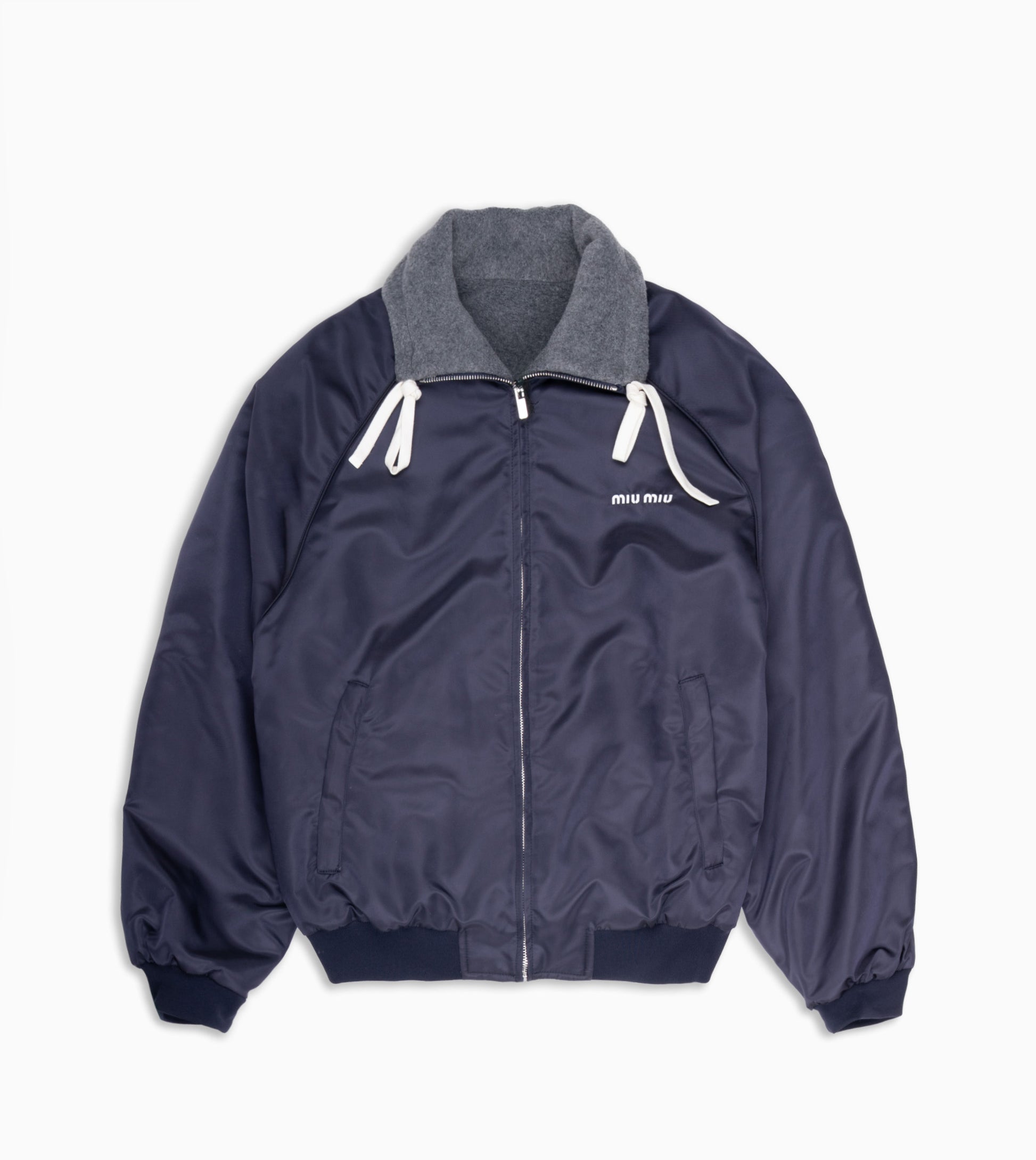 The texture of technical gazar combines with the softness of fleece in this reversible bomber jacket that exudes comfort and modernity. The masculine cut and references to classic sports uniforms define this versatile and striking piece.