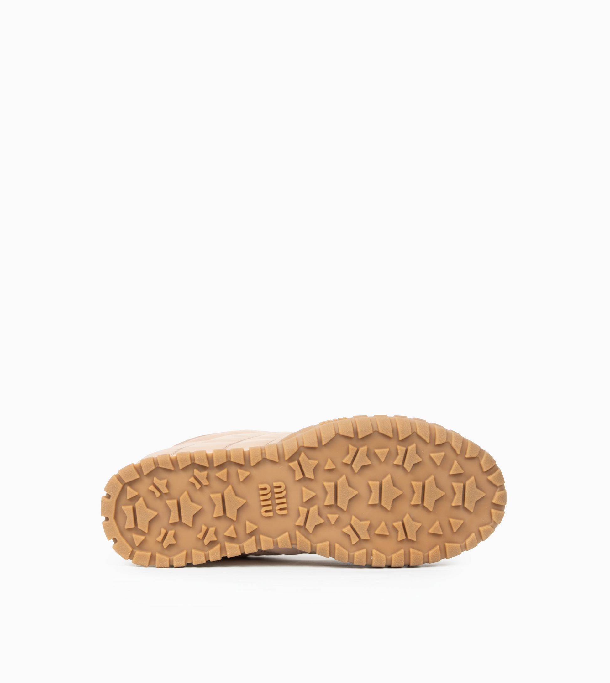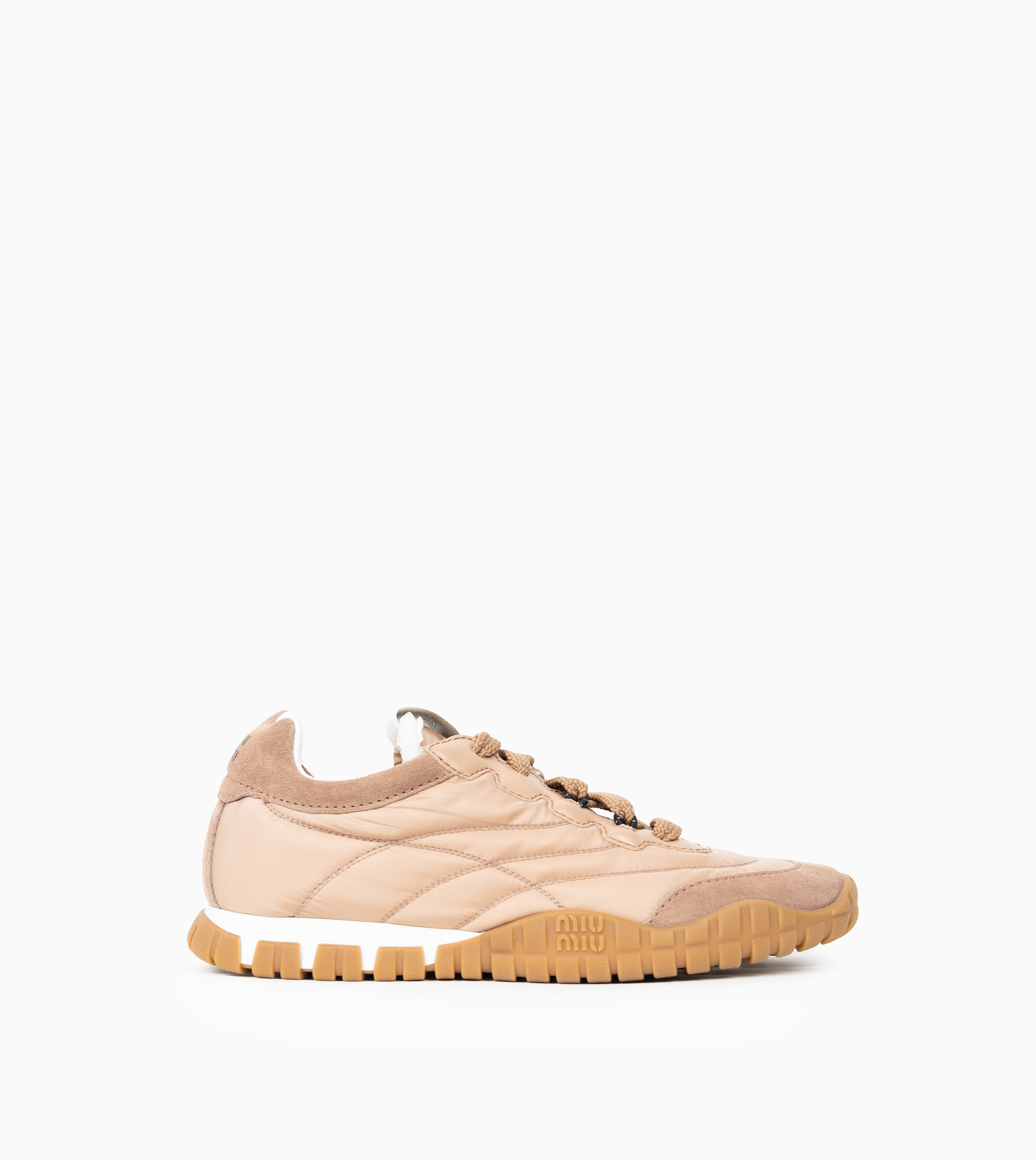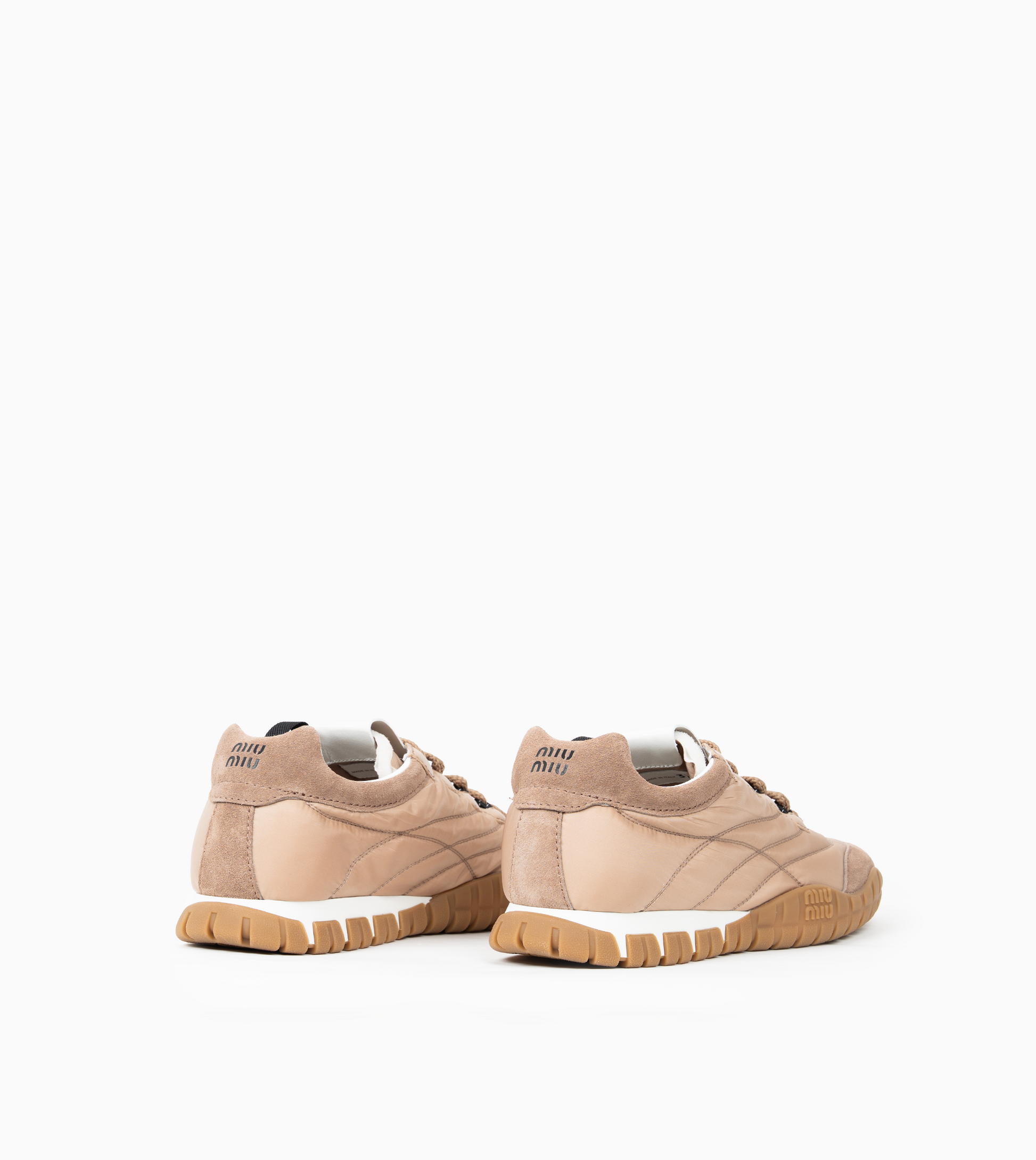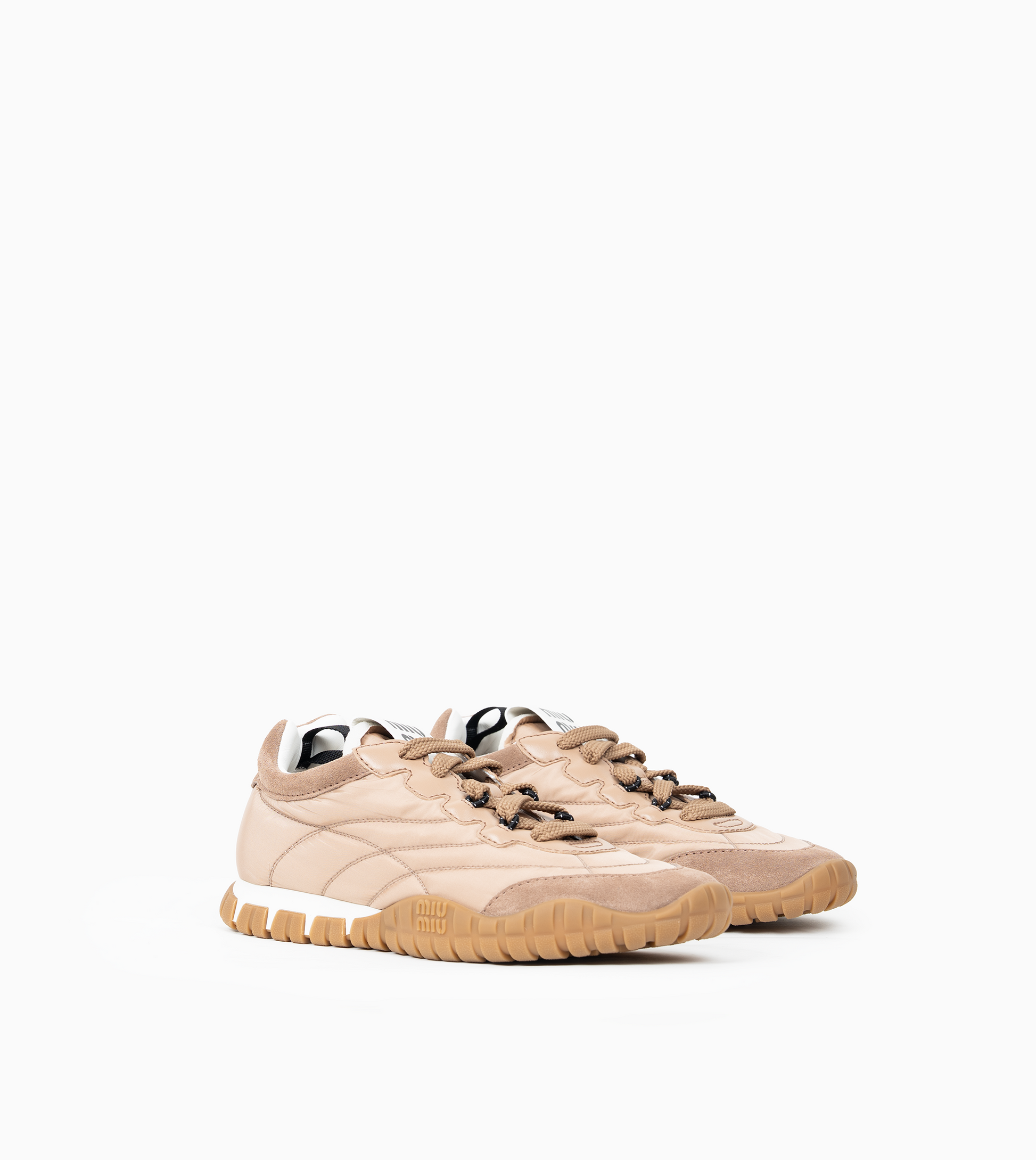 The Tyre model combines elegance and sporty functionality. The dynamic rubber sole, flexible and resistant to wear, resembles the pattern of tires. Made with technical fabric and suede, this version of the sneakers represents Miu Miu's bold identity.