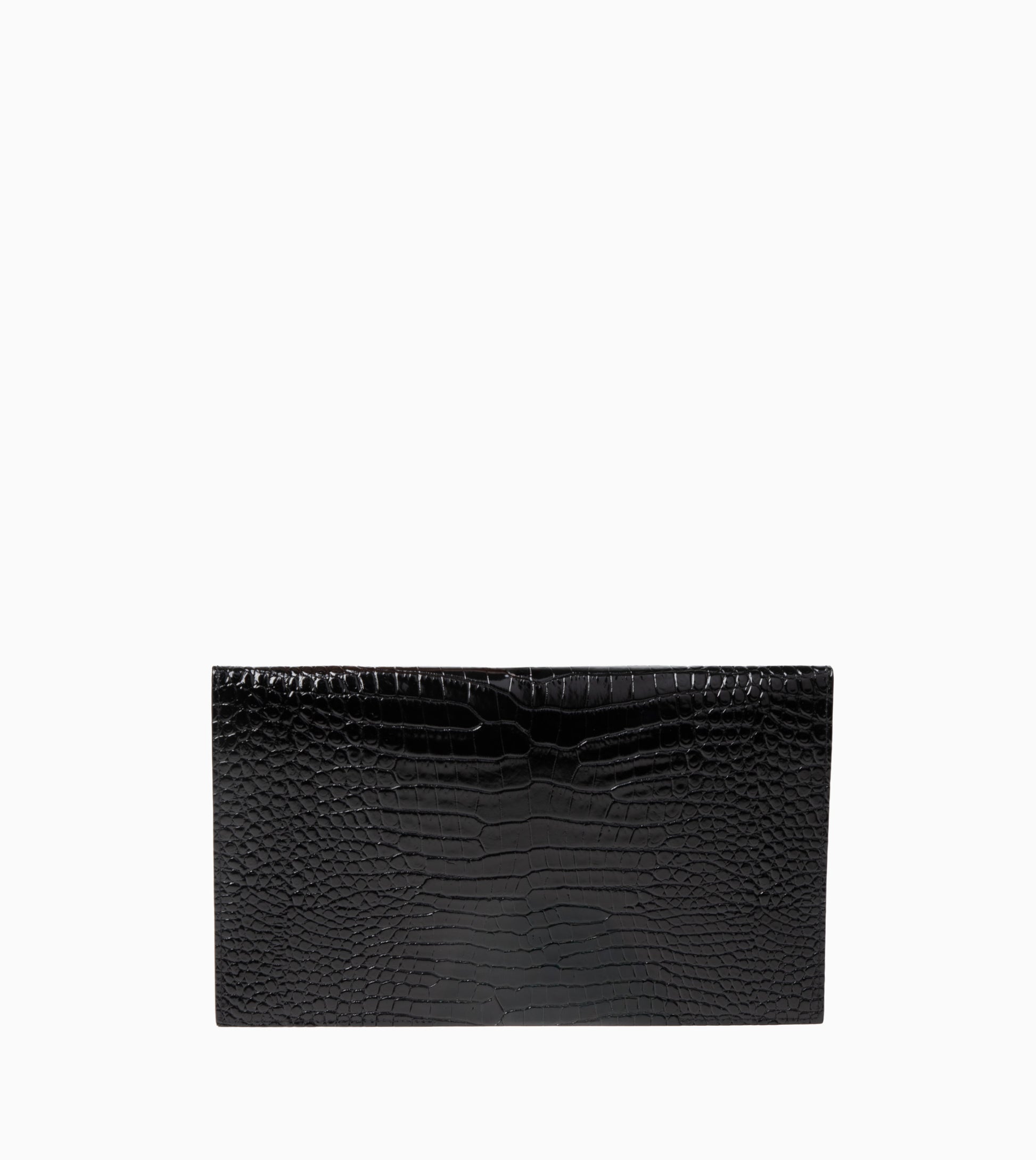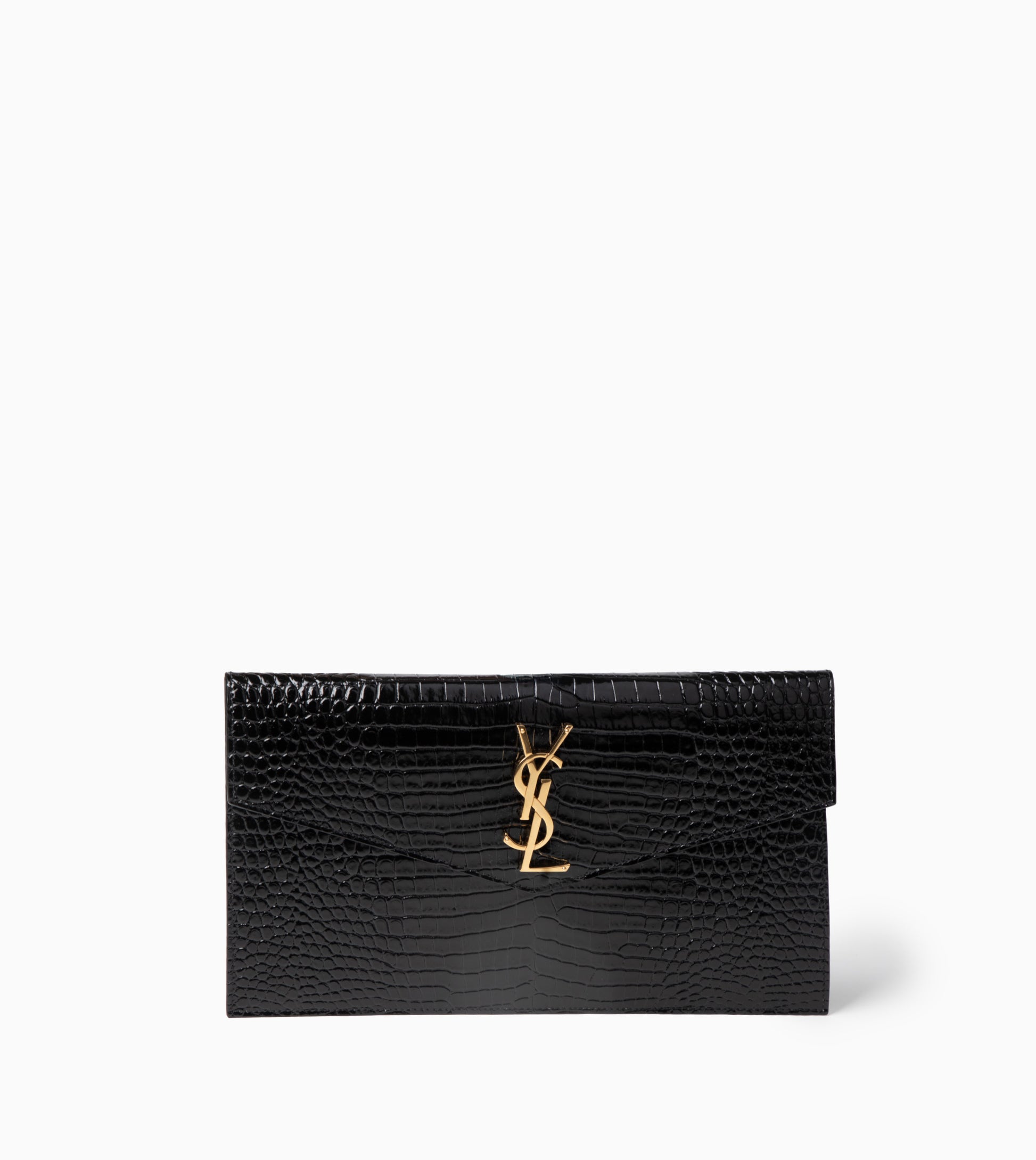 Small envelope-style pouch with flap adorned with metal YSL signature.