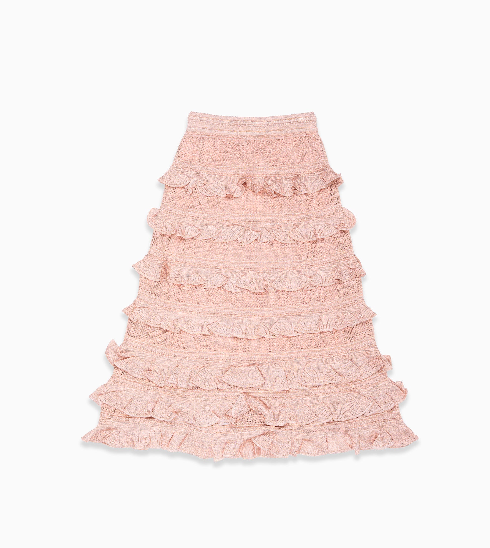 Midi Skirt with Ruffles Rebellion in metallic rose gold from our Cruise 2026 Collection, Twisted Romance. Midi knit skirt with elastic waistband and layered ruffles.