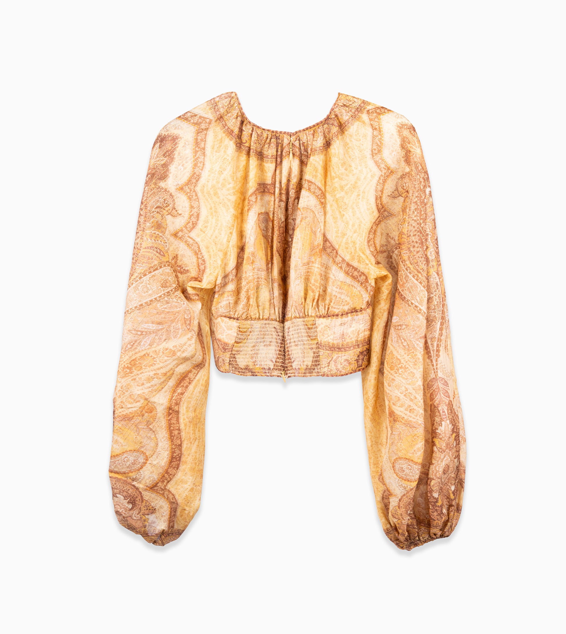 Wanderlust bustier in multi mustard tapestry color from our Resort 2026 Collection. Top made of a cotton-silk blend with long puffed sleeves and elastic cuffs, round neckline, and invisible zipper closure at the back.