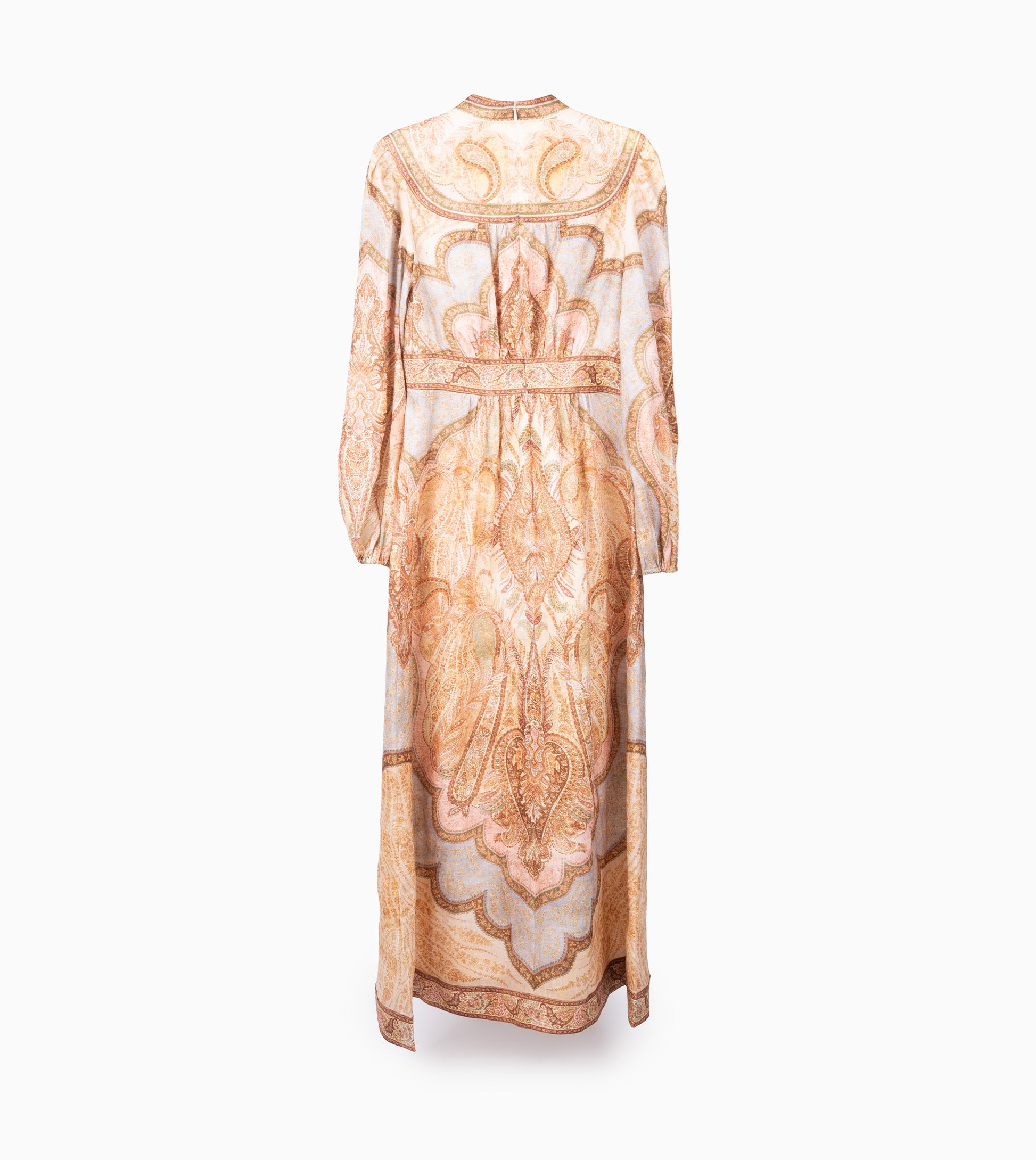 Midi dress with a deep Wanderlust neckline in multi-tapestry from our Resort 2026 Collection. Linen midi dress with a deep V-neckline, long wide sleeves with elastic cuffs, fitted waist, and flared skirt.